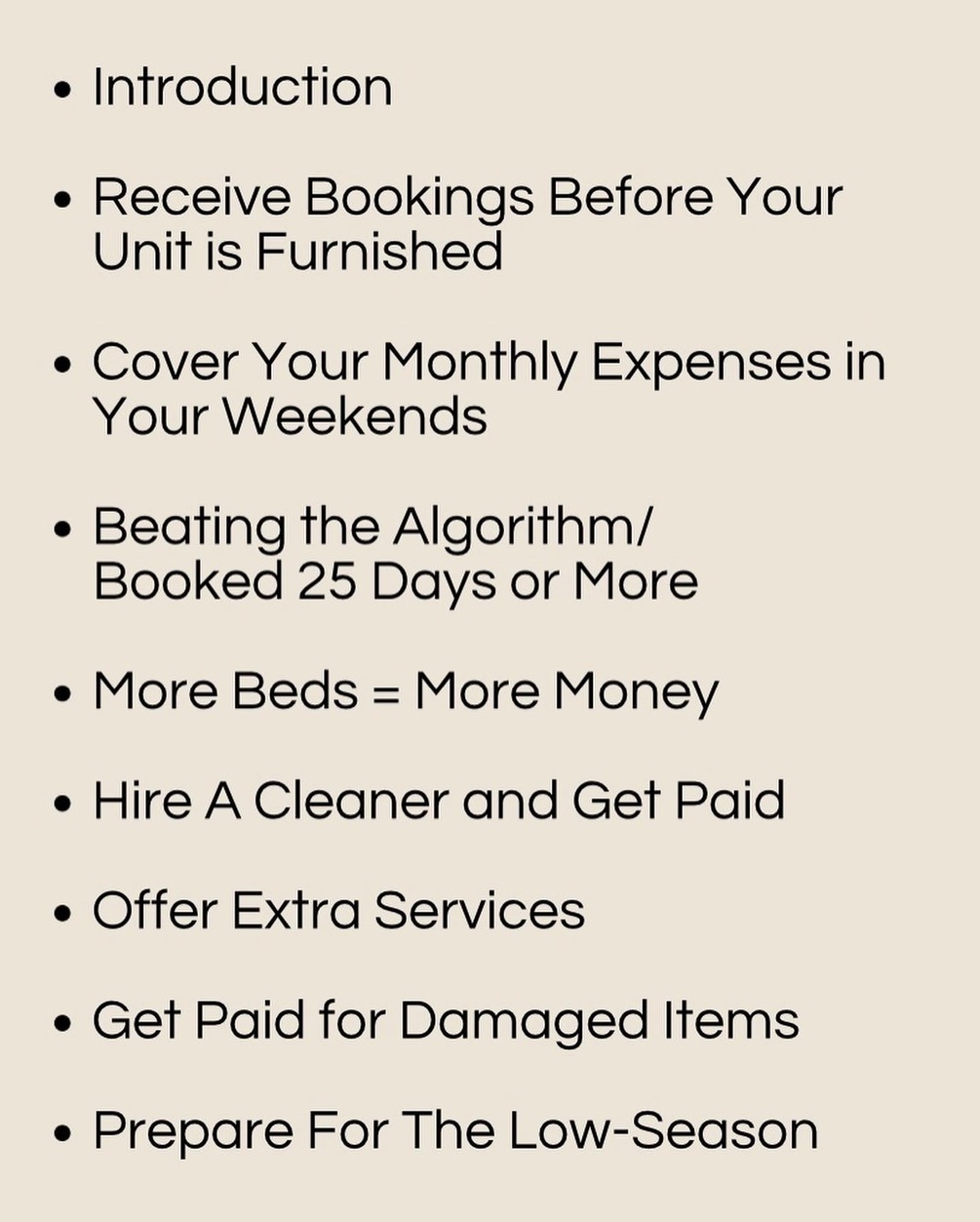 In addition, in the ebook you will learn many techniques on how to stay book for 25 nights or more, and how to maximize your profits outside of your nightly rate!
